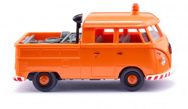 WIKING miniaturisiert den Transporter nach Originalvorbildern. Karosserie mit Doppelkabine und Pritsche kommunalorange. Warnlicht orangetransparent in mittigen Sockel eingesteckt. Frontscheinwerferlinsen transparent eingesteckt, Rückleuchten rottransparent eingefügt. Inneneinrichtung graublau, Fahrgestell und Lenkrad schwarzgrau. Stoßstangen vorne und hinten weiß mit rot bedruckter Warnschraffur eingesteckt, Felgen schwarz mit pastellorangener Radkappe. Frontseitiges VW-Logo schwarz bedruckt, Blinkerflächen rotorange. Scheinwerfergläser silbern hinterdruckt. Seitliche Türgriffe schwarz silbern bedruckt. Geräteeinsatz graublau mit schwarzem Suchscheinwerfer auf der Pritsche eingefügt.