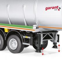 Rückwärtige Hinterachse lenkt vorbildgerecht mit Das 1:32-Modell entsteht in Handarbeit, eine Vielzahl von Bauteilen aus Zinkdruckguss und Kunststoff werden präzisionsgenau zusammengefügt. Im abgekoppelten Zustand kann der Tanksattelauflieger mühelos auf die ausziehbaren Stützen gestellt werden, sodass eine vorbildgerechte Alltagspräsentation möglich ist. Heckseitig können überdies die Kupplungsarmaturen zum Ablassen praxisgerecht geschwenkt werden. Genauso gut lässt sich das Bedienpult öffnen und wieder verschließen. Um die vorbildgerechte Wendigkeit herzustellen, ist die Hinterachse lenkbar angelegt, die Achsen sind gefedert und die Funktion der Lift-Achse lässt sich nachvollziehen.