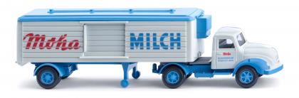 Mit seiner Eismarke „Moha“ kämpften die Hessen gegen die ganz großen Anbieter wie Langnese und Schöller, die damals den wachsenden Eismarkt aufrollten. 1985 kam das Aus für Moha – Unternehmen und Marke verschwanden aus der bundesrepublikanischen Konsumwirklichkeit. Fahrerhaus papyrusweiß, Inneneinrichtung blaugrau. Fahrgestell mit Anhängerkupplung und Felgen babyblau. Kotflügel babyblau bedruckt. Frontseitiges Magirus-Logo mit ebenfalls silbernem Zierrat auf der Kühlerhaube. Stoßstange babyblau bedruckt. Seitliche Türbedruckung mit karminrotem Moha-Schriftzug sowie babyblauem Unternehmenshinweis auf „Milchversorgung Frankfurt Main“. Türgriffe gesilbert, Rückleuchten karminrot bedruckt. Kühlkoffer mit Seitentür papyrusweiß, Dach und Kühlaggregat babyblau. Fahrgestell mit Stützrollen, Felgen und Kotflügeln babyblau. Seitlich karminroter Moha-Schriftzug und babyblauer „Milch“-Schriftzug. Rückleuchten karminrot bedruckt.