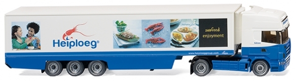 Fahrerhaus in weiß, Fahrerhausunterteil sowie seitlicher Unterfahrschutz in signalblau bedruckt. Inneneinrichtung basaltgrau, Lenkrad schwarz. Blende oberhalb der Windschutzscheibe schwarz. Vordere Verkleidung mit Stoß-fänger signalblau. Felgen silber. Spiegelsatz schwarz. Fahrerhausverglasung mit schwarzer Scheibenumrandung und Scheibenwischer in schwarz, Sca-nia-Logo in silber. Vorderer Lufteinlass und Grillstreifen schwarzgrau so-wie Firmengestaltung in schwarz und signalblau mit Schriftzug „Heiploeg“. Vordere Scheinwerfer gesilbert. Stoßstangenverkleidung mit schwarzgrauen Streifen sowie Typenhinweis „R 420“ in silber. Aufliegerkoffer mit Dach und Doppeltür weiß, Aufliegerfahrgestell mit Achshalterung und Kotflügeln schwarz. Untere Vollverkleidung signalblau. Heckseitiger Unterfahrschutz schwarz. Kühlaggregat in weiß, Felgen silber. Seitlich mehrfarbige Marken-gestaltung von „Heiploeg“ mit signalblauem Schriftzug und mehrfarbigen Werbemotiv, heckseitig ebenso.