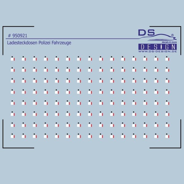 In diesem Decal sind die typischen Ladesteckdosen bei Polizei Fahrzeugen im Maßstab 1/87 abgedruckt. In dem Decal sind 120 Stück integriert.