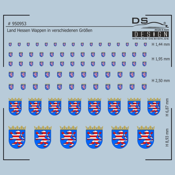 Das Decal # 950953 bildet das Wappen des Landes Hessen in verschiedenen Größen ab. So können verschiedene Modelle entsprechend vorbildkonform beschriftet werden. Die Maße sind entsprechend in dem Decal angegeben. Das Decal ist für den Maßstab 1/87 vorgesehen und ist in Abstimmung mit den Decals # 950938 und # 950939 in den Höhen der jeweiligen Schriftzüge abgestimmt. So kann individuell das Wappen vor den Schriftzügen auf den Modellen angebracht werden.
