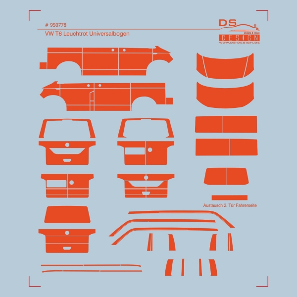Sie erhalten hier ein im Siebdruckverfahren hergestelltes Decal mit leuchtroten Karosserieflächen für den VW T6 der Firma Herpa. Mit diesem Decal können Sie sowohl die Bus-Variante mit Heckklappe als auch die Transportervariante mit Hecktüren erstellen.