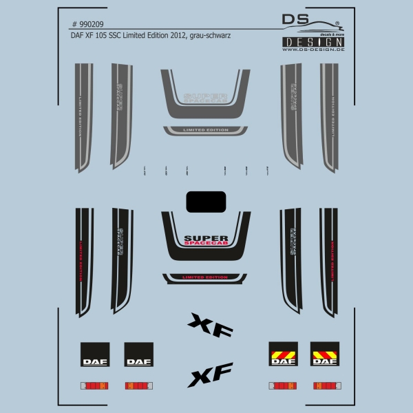 Hierbei handelt sich um ein im Maßstab 1:87 angeordnetes Decal der Limited Edition 2012 des DAF XF 105 SSC in dunkelgrau und in schwarz. Aus dem Decal können komplett zwei Sattelzugmaschinen dekoriert werden, ebenfalls kann aus drei verschiedenen Typenbezeichnungen gewählt werden.