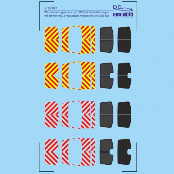 Das Decal # 950865 bildet die Heckwarnmarkierungen des Mercedes-Benz Sprinter 06/13 in den verschiedensten Versionen ab. Es wird in Gelb-Rot und Rot-Hellgrau abgedruckt.