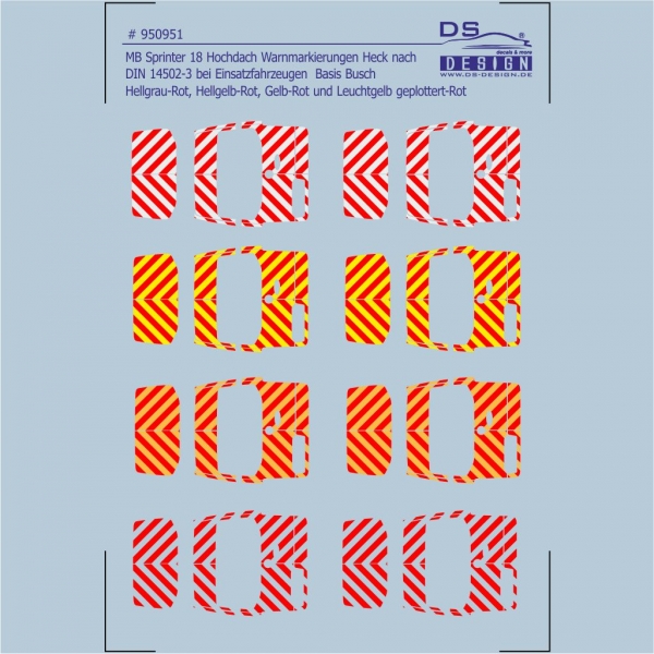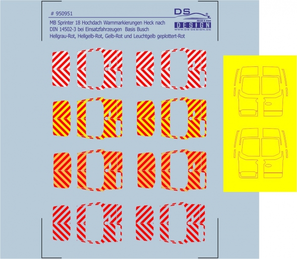 Das Decal # 950951 bildet die Heckwarnmarkierungen des Mercedes-Benz Sprinter 2018 kurzer Radstand mit Hochdach Basis Busch in den verschiedensten Versionen ab. Es wird in Hellgelb Rot und Dunkelgelb Rot sowie Hellgrau Rot und als Neuheit Leuchtgelb geplottet Rot abgedruckt.