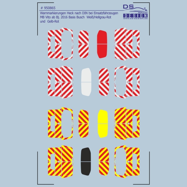 Das Decal # 950865 bildet die Heckwarnmarkierungen des Mercedes-Benz Vito in den verschiedensten Versionen ab. Es wird in gelb rot und rot hellgrau abgedruckt. Das Decal ist für das Basismodell der Fa. Busch für den MB Vito ab Baujahr 2016 vorgesehen.