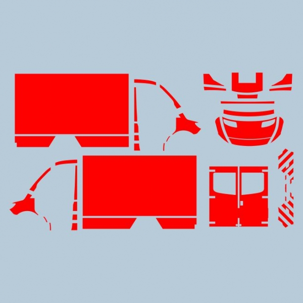 Aus einer großen Decalfläche wurden hier mit einem speziellen Schneidplotter und einem besonderen Verfahren die passenden Flächen für das Modell ausgeschnitten. Die Flächen haben den gleichen Farbton wie die aktuelle Generation der leuchtroten Decals im Shop. Allerdings sind diese Decals nicht mit einer Klarlackschicht verbunden, da sie aus einer großen Fläche geschnitten wurden. Das bedeutet, dass jede Fläche einzeln auf dem Modell aufgebracht werden muss. Die Verarbeitung ist aber sehr gut möglich.
