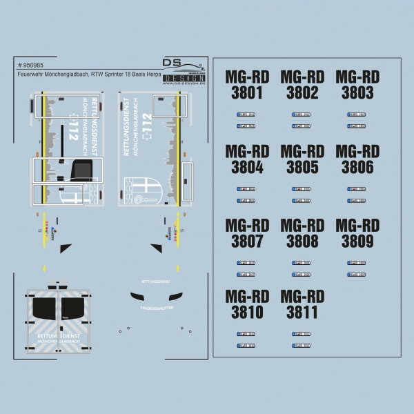Sie erhalten hier ein Decalsset Leuchtrot geplottet und Digitaldruck UV für den RTW Feuerwehr Mönchengladbach Sprinter 18 mit Fahrtec. Die Basis dafür ist der Herpa Fahrtec RTW Sprinter 18.