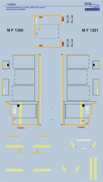 Für einen realistischen Nachbau des LF KatS der Freiwilligen Feuerwehr München bieten wir Ihnen hier die komplette Beschriftung an. Es handelt sich bei dem Decal um die farbige Beschriftung des Fahrzeuges als Decal, die im Vorbild in Leuchtgelb ausgeführten Streifen werden in einem hellen Gelb gedruckt. Bilder zum richtigen Bau des Modells und Verarbeitungshinweise für das Decal sind ebenfalls im Lieferumfang enthalten.