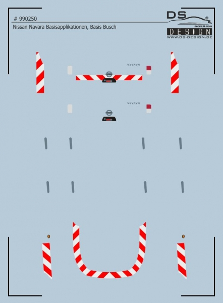 Das Decal # 990250 bildet die Basisapplikationen für den Nissan Navara der Fa. Busch ab. So können Sie also nach der Lackierung Ihr Modell entsprechend vervollständigen. Ebenfalls sind in diesem Decal auch entsprechende vorbildkonforme Rückleuchtenimitationen und Warnmarkierungen für den kommunalen Einsatz enthalten.