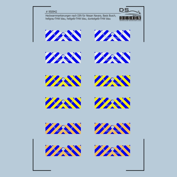 Das Decal # 950942 bildet die Heckwarnmarkierungen für den Nissan Navara Basis Busch ab. Die Heckwarnmarkierungen werden in hellgelb-THW blau, hellgrau-THW Blau und dunkelgelb-THW Blau abgedruckt.