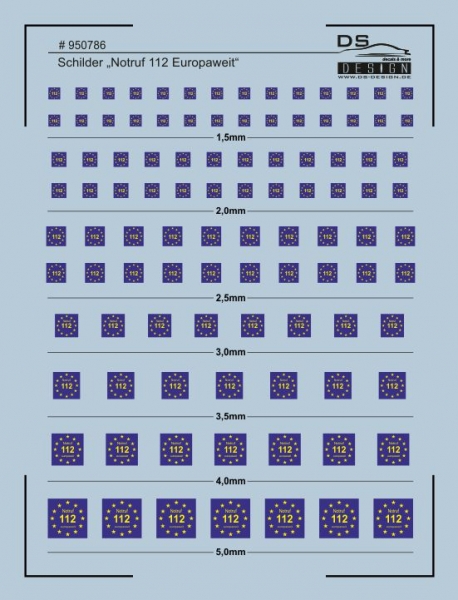 Das Decal # 950786 bildet die europaweiten Notrufzeichen 112 in verschiedenen Größen ab. Die einzelnen Notrufzeichen in unterschiedlichen Mengen sind in 1,5 mm, 2,0 mm, 2,5 mm, 3,0 mm, 3,5 mm, 4 mm und 5 mm abgedruckt, so dass Sie je nach Größe fast alle Einsatzfahrzeugmodelle damit ausrüsten können.