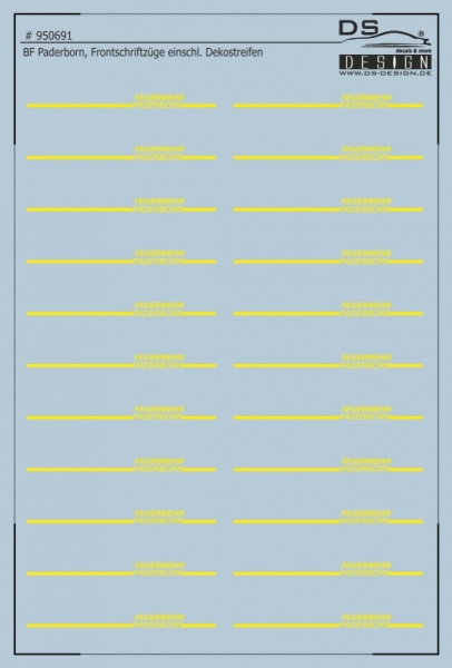 Das Decal # 950691 beinhaltet die typischen Frontschriftzüge mit dem gelben Dekostreifen. Dieser ist extra nach beiden Seiten hin etwas länger ausgeführt, so dass er, je nach Fahrzeuggröße, abgelängt werden kann.