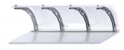 Organische Formen prägten die Fünfzigerjahre. Kein Wunder, dass auch die offenen Parkhallen mit einem geschwungenen Dach für den Wetterschutz der Autos sorgten. Das Vorbild der Parkhalle gab es vielerorts, da es mit schlichten Fundamenten an nahezu jedem Ort innerhalb weniger Tage aufgebaut werden konnte. Auch Autohäuser setzten auf die Strahlträger mit der geschwungenen Dachfläche. Anders als viele der WIKING-Automodelle aus jenen Produktionsjahren, blieb die Parkhalle den meisten Sammlern vorenthalten. Sie wurde zwar fertig montiert angeboten, nahm allerdings in dem Mehrstückkarton viel Platz weg und führte mangels geringer Nachfrage vom Handel bei der regelmäßigen Order eher ein Schattendasein. Dementsprechend ist ihr Beliebtheitsgrad bis heute erheblich gestiegen. Mit der Revitalisierung der Formen der von 1962 bis 1968 erhältlichen Parkhalle erfüllt WIKING die Wünsche vieler Sammler. Bodenplatte perlgrau, Stützstreben silber, Welldach transparent.
