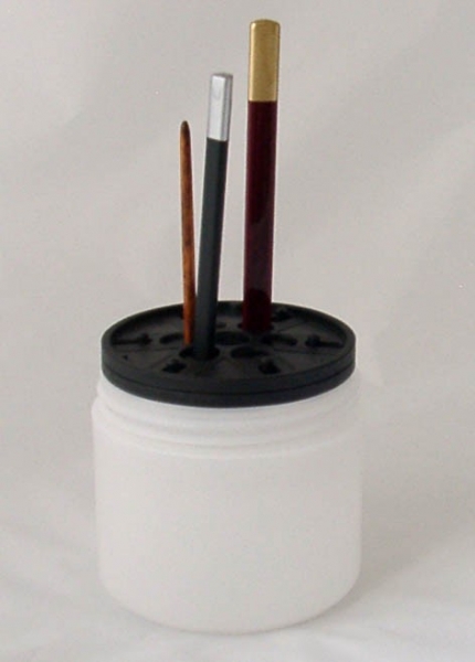 Die Pinselwaschdose eignet sich ideal zum Auswaschen und Aufbewahren von Pinseln im Wasserbehälter direkt am Arbeitsplatz. Der Deckel kann leicht abgenommen werden. Durch die Spannvorrichtung kann der einzelne Pinsel nicht nach unten in die Dose rutschen und die Pinselhaare können nicht beschädigt werden.