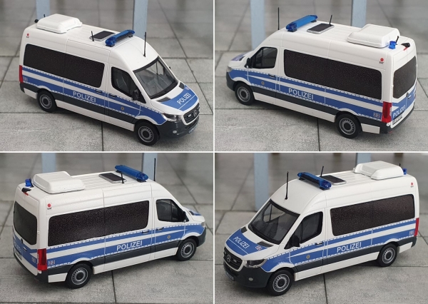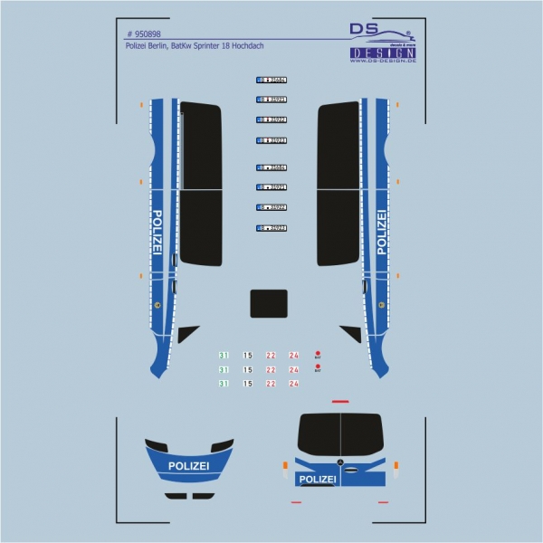 Sie erwerben hier ein Decal, gedruckt im Digitaldruck. Das Decal bildet die Beschriftung eines Bearbeitungskraftwagens der Polizei Berlin ab, ein sog. BatKw. Es handelt sich dabei um einen Mercedes-Benz Sprinter, Version ab Baujahr 2018 mit mittellangem Radstand in der Hochdachversion. Das Basismodell stammt von der Fa. Herpa.