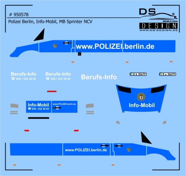 Es handelt sich hierbei um einen im Digitaldruck gedruckten Beschriftungssatz auf durchgängiger Decalfolie des Infomobils der Polizei Berlin. Die Druckwerke müssen konturenscharf ausgeschnitten werden.