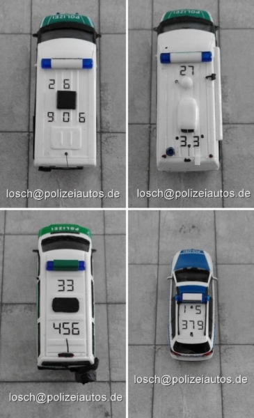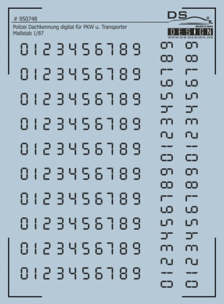Es handelt sich bei diesem Decal um die typischen Dachbeschriftungen der Polizeifahrzeuge mit digitaler Schriftart. Durch die Zahlenreihen kann die gerade benötigte Dachkennung selbst erstellt werden. Die einzelnen Zahlen weisen eine Höhe von 3,0 mm auf und sind für PKW und Transporter der Polizei geeignet.