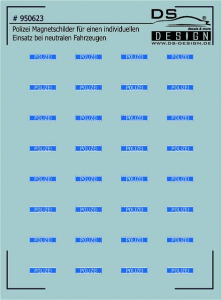 Ein Decalsatz mit den typischen Magnetschildern, die hauptsächlich bei der Bereitschaftspolizei Verwendung finden. Bei "neutralen" Einsatzfahrzeugen werden diese Schilder bei individuellen Einsätzen zusätzlich zu den Magnetblaulichtern angebracht. Das Decal beinhaltet insgesamt 24 Magnetschilder.