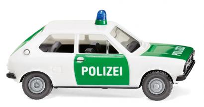Der VW Polo der ersten Generation mit den Genen des Audi 50 sollte 1975 unterhalb der Golf-Klasse eine bis heute erfolgreiche Typenreihe begründen und immer wieder Einzug in die behördlichen Fuhrparks halten. Karosserie weiß. Inneneinrichtung mit Sitzen und Lenkrad schwarz. Fahrgestell mit Stoßstangen und Kühlergrill schwarz. Frontseitig gesilbertes VW-Logo. Felgen silber. Türen sowie Motorhaube und Kofferraumklappe mintgrün. Schriftzüge „Polizei“ weiß. Rücklichter rot, Blinker orange bedruckt. Rückfahrscheinwerfer silbern. Frontseitige Blinker auf der Stoßstange orange bedruckt. Fenstergummis schwarz, Türschlösser gesilbert.