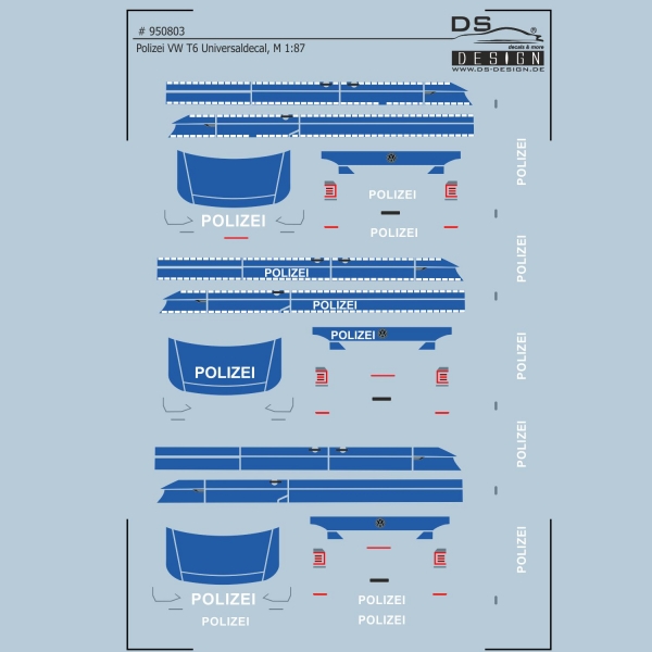Mit diesem Decal können insgesamt drei Modelle erstellt werden. Die zum Teil gesondert angeordneten Polizeischriftzüge können individuell angebracht werden. Die blauen sog. Bauchbinden ohne Reflexstreifen können für die Justiz etc. verwendet oder auch wahlweise nachträglich mit den einzeln erhältlichen GAPS ergänzt werden.