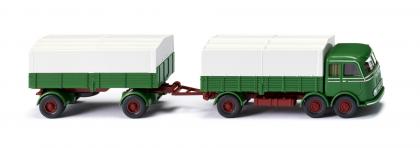 WIKING hat der Pullman-Generation ein modellbauerisches Denkmal gesetzt – ganz vorn der Mercedes-Benz LP 333 mit doppelter Vorderachse. Der „Tausendfüßler“ von Mercedes-Benz markiert den Beginn der logistischen Wertschätzung von Frontlenker-Lkw, die seinerzeit weit hinter den Haubern zurücklagen. Schon in den sechziger Jahren hatten sich die Traditionsmodellbauer allein für die Pullman-Zugmaschine mit kurzer Kabine entschieden, WIKING hatte dann 2019 auf Basis historischer Muster des legendären Modellbaumeisters Alfred Kedzierski nachgelegt und den „Tausendfüßler“ mit Fernverkehrskabine miniaturisiert. Mercedes-Benz hatte den ungewöhnlichen Lkw mit doppelter Vorderachse zum Ende der 1950er-Jahre als Notlösung aufgrund der Seebohmschen Gesetze gebaut. Nur durch die dritte Achse war es möglich gewesen, einen Lkw mit einem zulässigen Gesamtgewicht von 16 Tonnen zu bauen. 1960 wurde das zulässige Gesamtgewicht für zweiachsige Lastwagen dann wieder von 12 auf 16 t erhöht. Deshalb lief der LP 333 nur von 1958 bis 1961 vom Band. Es entstanden insgesamt 1833 Fahrzeuge, 354 davon im letzten Produktionsjahr. Fahrerhaus und Pritsche sowie Kühlergrill grasgrün mit gesilbertem Zierrat. Inneneinrichtung rubinrot. Scheinwerfer per Hand gesilbert. Lenkrad hellelfenbein eingesetzt. Fahrgestell mit Kardanteil und Felgen oxidrot, Stoßstange mit Doppelkotflügel grasgrün. Verdeck lichtgrau. Anhänger mit oxidrotem Fahrgestell, grasgrüner Pritsche und lichtgrauem Verdeck. Einlegeboden grasgrün, Felgen oxidrot. Fahrerhaus mit gesilberten Zierleisten und Türgriffen sowie orangen Blinkern. Rückleuchten rot bedruckt.