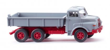 Mächtiger Hauber, charakteristisch MAN: Mit diesem Pritschenkipper wirkt das Baustellenfahrzeug smarter als all seine Typenvorgänger. Dank seiner dicken Backen besitzt der MAN-Hauber ein typenprägendes Erscheinungsbild, das lange Zeit die Szenerie auf deutschen Baustellen bestimmte. Der Dreiachser erfährt mit dieser Pritsche eine zeitgenössisch verdiente Gestaltung, die sich nahtlos in die traditionsreiche WIKING-Palette mit MAN-Kippern einfügt. Fahrerhaus, Pritsche und Heckbracke silbergrau, Inneneinrichtung mausgrau. Fahrgestell, Kardanteil und Trilex-Felgen signalrot. Roter Kühlergrill mit silbern bedrucktem Zierrat und MAN Diesel-Schriftzug. Scheinwerfer vorn gesilbert. Blinker in orange, Rückleuchten in rot bedruckt.