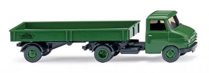 Opel hatte das WIKING-Vorbild schon bei der Kurzhauer-Vorstellung im Programm präsentiert. Ganz nach Vorbild der Karosserie-Schmiede „Dinkel“ war der „kleine“ Sattelzug im damaligen Opel-Prospekt zu sehen. WIKING-Gründer Fritz Peltzer entschied sich, den Opel Blitz in gleich mehreren Varianten zu bauen. So fand der von Opel 1960 vorgestellte Blitz-Kurzhauber als Pritschensattelzug wenig später seine WIKING-Programmpräsenz. Heute sind Auflieger mit Opel Blitz-Zugmaschine eine wirkliche Seltenheit in der breiten Schar der Klassiker. Laubgrünes Fahrerhaus. Getönte Verglasung, frontseitig gesilberter Zierrat sowie Opel-Logo und Scheinwerfer gesilbert. Türgriffe silber. Fahrgestell mit Sattelplatte und Kotflügel in schwarzgrau. Felgen in laubgrün. Laubgrüne Aufliegerpritsche mit mausgrauem Einlegeboden. Aufliegerfahrgestell und hintere Kotflügel in schwarzgrau. Heckleuchten an Zugmaschine und Auflieger rot bedruckt. Pritsche mit Logo „Dinkel“ in schwarz.