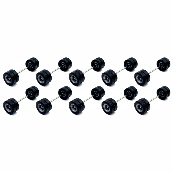 Sie erwerben hier je 10 Stück Reifen einschl. silberner Felgen für Auflieger der Meusburger-Klasse oder anderen Schwerlastaufliegern. Die Felgen weisen einen Durchmesser von 5,50 mm und die Reifenbälge einen Durchmesser von 9,0 mm auf. Die Reifenflanke beträgt 2,90 mm.