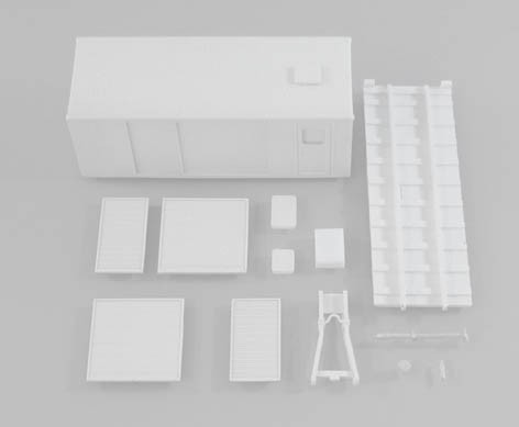 Der Abrollbehälter wurde als CAD Modell anhand von Fotos originalgetreu erstellt. Das Modell wurde schon am Computer auf die Passgenauigkeit und das Größenverhältnis der einzelnen Bauteile überprüft. Jedes produzierbare kleine filigrane Bauteil entspricht dabei dem Vorbild. Das Modell wurde in einem speziellen Verfahren erstellt, so dass Sie eine glatte und sofort lackierfähige Oberfläche erhalten. Dadurch bleiben ebenfalls alle Feinheiten bestehen.