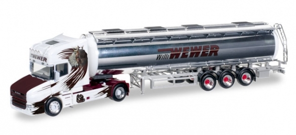 Willi Wewer aus Cloppenburg hat sich auf Tanktransporte spezialisiert und dabei ein Faible für Hauber entwickelt. Mit diesem ganz besonders aufwändigen Fahrzeug sorgte das Unternehmen auf der IAA 2014 für Aufsehen. Neben der Airbrush-Lackierung setzt Herpa im Modell auch liebevolle Details wie die zweiteiligen Chromräder oder den weißen Lampenbügel im Modell um.
