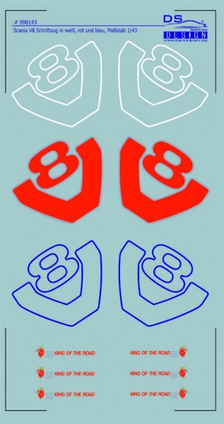 Der typische V8 Schriftzug für die Seitenflächen der Fahrerhäuser des Scania 144 Topline in weiß, rot und blau. Die Krone des Scania-Greifs im Schriftzug "King of the Road" ist in gold gedruckt.