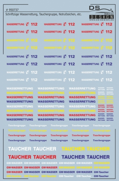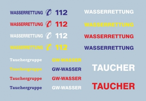 Sie erhalten hier Schriftzüge Wasserrettung, Tauchergruppe einschl. Notrufzeichen in verschiedenen Ausführungen und Farben. Alle Schriftzüge sind für den Maßstab 1/87 erstellt und passen auf Transporter- und Löschfahrzeugmodelle.