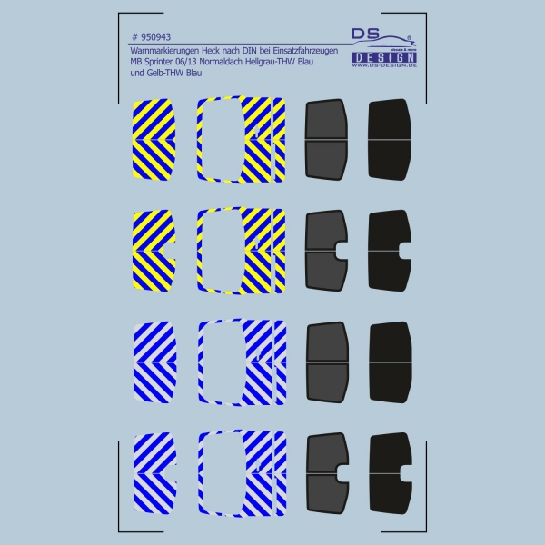 Das Decal # 950943 bildet die Heckwarnmarkierungen des Mercedes-Benz Sprinter 06/13 in den verschiedensten Versionen ab. Es wird in Gelb-THW Blau und Hellgrau-THW Blau abgedruckt.