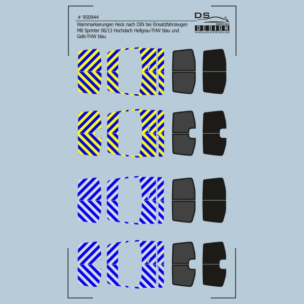 Das Decal # 950944 bildet die Heckwarnmarkierungen des Mercedes-Benz Sprinter 06/13 in den verschiedensten Versionen ab. Es wird in Gelb-THW Blau und Hellgrau-THW Blau abgedruckt.