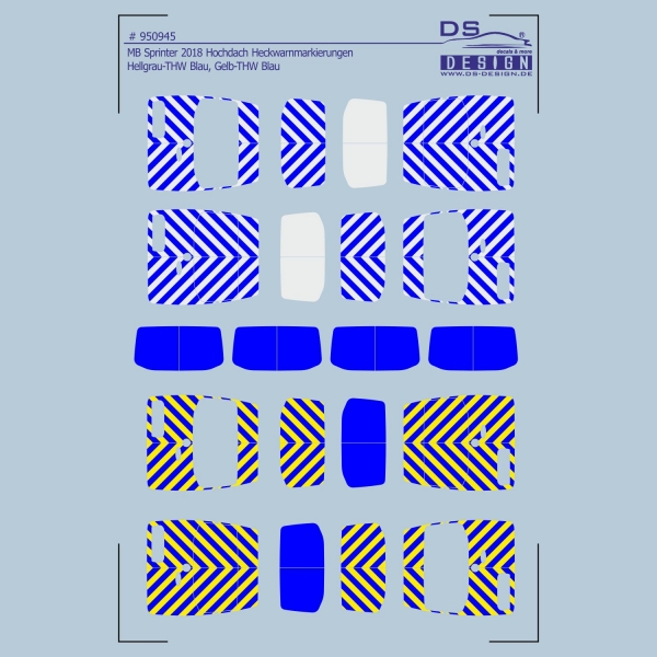 Das Decal # 950945 bildet die Heckwarnmarkierungen des Mercedes-Benz Sprinter 2018 in verschiedenen Versionen ab. Es wird in Gelb-THW Blau und Hellgrau-THW Blau abgedruckt.