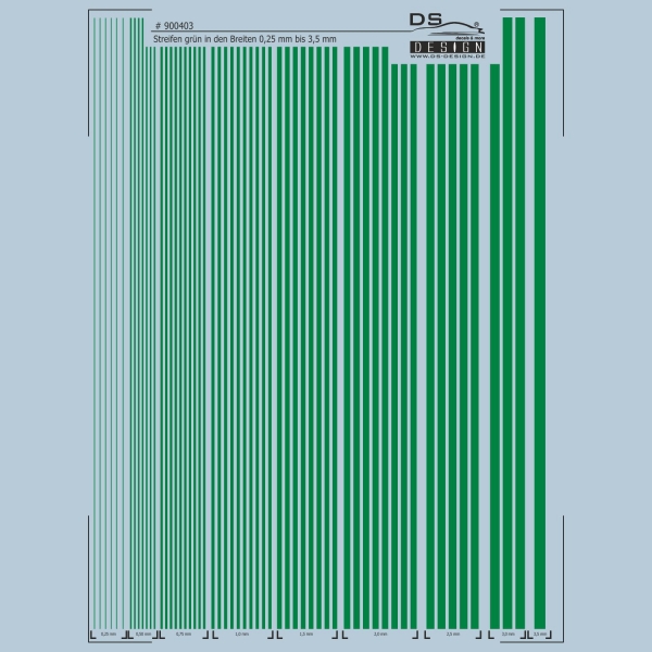 Inhalt: 1 Stück Decal mit insgesamt 58 Streifen in den Breiten von 0,25 mm bis 3,5 mm.