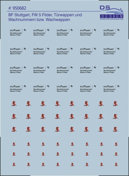 Bei dem Decal # 950682 handelt es sich um die Türwappen der Feuerwache 5 Filder der BF Stuttgart einschl. der Wachwappen in zwei verschiedenen Größen integriert mit den Wachnummern.