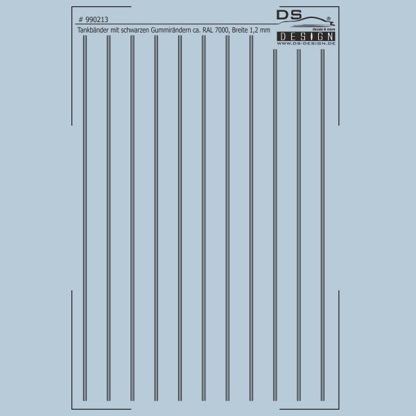 Das Decal # 990213 Tankbänder in ca. RAL 7000 mit schwarzen Gummibändern eignet sich auch optional zur Ausgestaltung von Großserienmodellen. In diesem Decal sind insgesamt 11 Tankbänder in folgenden Maßen enthalten: