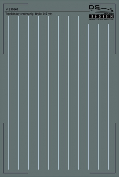 Das Decal # 990161 Tankbänder in Chromoptik eignet sich optimal zur Ausgestaltung von Großserienmodellen. In diesem Decal sind insgesamt 11 Tankbänder in folgenden Maßen enthalten: