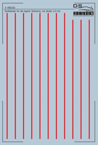 Das Decal # 990165 Tankbänder rot eignet sich optimal zur Ausgestaltung von Großserienmodellen. In diesem Decal sind insgesamt 11 Tankbänder in folgenden Maßen enthalten: