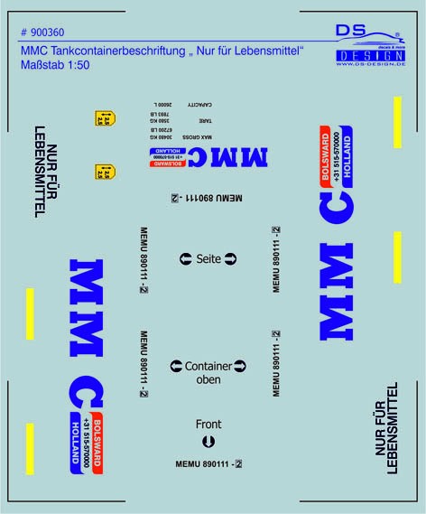 Das Decal # 900360 MMC Tankcontainerbeschriftung ist ideal für die Bestückung von 20 Fuß-Tankcontainen der führenden Hersteller, wie WSI, Conrad oder auch NZG. Andere Containernummerierungen und Codierungen können indiviuell nach Kundenwunsch angefertigt werden.