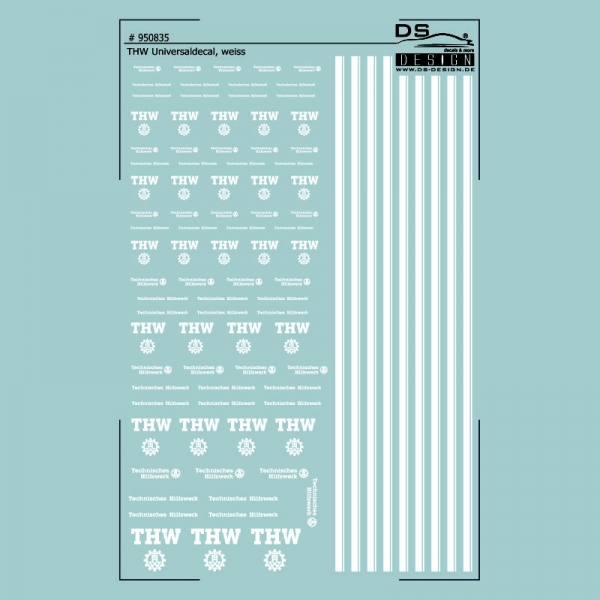 Das Decal # 950835 beinhaltet in verschiedenen Größen die Schriftzüge des Technisches Hilfswerkes in weiss im Maßstab 1/87. Diese werden bei blauen Fahrzeugen an verschiedenen Stellen verwendet.