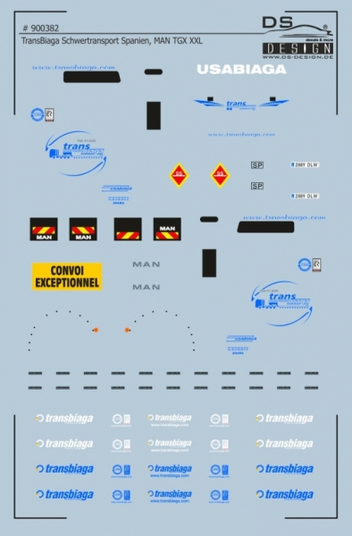 Das Decal # 900382 beinhaltet eine Beschriftung für eine MAN TGX XXL Schwerlastzugmaschine des Schwertransportunternehmens TransBiaga. Das Decal wird mit Verarbeitungshinweisen geliefert.