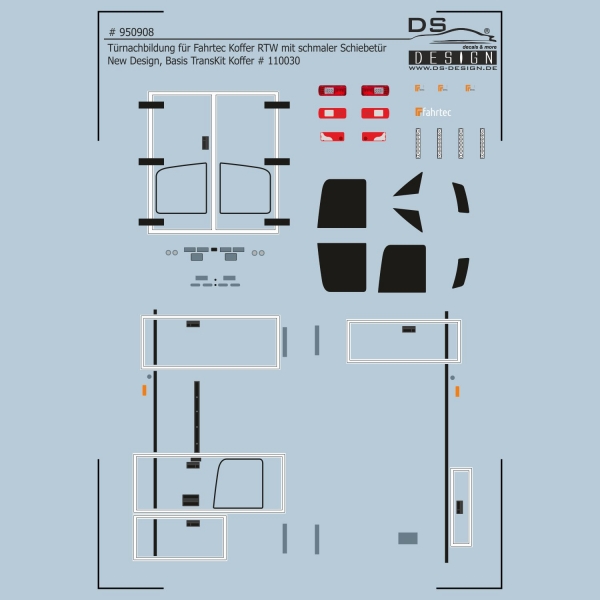 Bei diesem Decal # 950908 handelt es sich um Türnachbildungen in Weiß Schwarz umrahmt für den Fahrtec ITW / RTW mit Drehtür # 110030 einschl. Herpa MiniKit Modell der Fa. DS-Design. Die Türumrahmungen sind mit schwarzen Außenkonturen ausgeführt, innerhalb der Außenkonturen ist die Farbe Weiß angeordnet. Die Türnachbildungen und restlichen Basisapplikationen für den Mercedes-Benz Sprinter Triebkopf sind auf die ebenfalls erhältlichen leuchtroten Karosserieflächen abgestimmt.