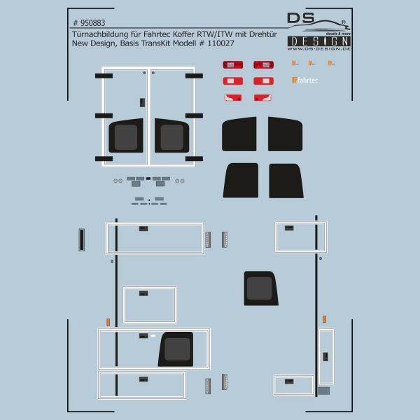 Bei diesem Decal # 950883 handelt es sich um Türnachbildungen in Weiß Schwarz umrahmt für den Fahrtec ITW / RTW mit Drehtür # 110027 einschl. Herpa MiniKit MOdell der Fa. DS-Design. Die Türumrahmungen sind mit schwarzen Außenkonturen ausgeführt, innerhalb der Außenkonturen ist die Farbe Weiß angeordnet. Die Türnachbildungen und restlichen Basisapplikationen für den Mercedes-Benz Sprinter Triebkopf sind auf die ebenfalls erhältlichen leuchtroten Karosserieflächen abgestimmt.