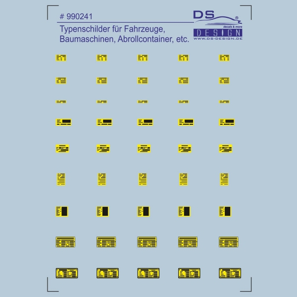 Das Decal enthält verschiedene Versionen an Typenschilder, wie Sie an Nutzfahrzeugen, Baumaschinen, Abrollcontainern und Arbeitsmaschinen etc. vielfach angebracht sind. Die Typenschilder sind stilisiert dargestellt und sind in gelber Ausführungen mit schwarzen Schriften gedruckt.