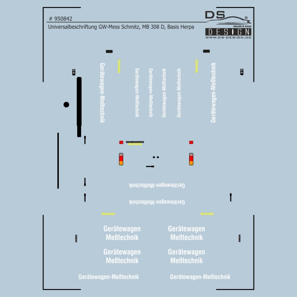 Das Decal # 950842 beinhaltet die typischen Beschriftung des Gerätewagen Meßtechnik der verschiedenen Feuerwehren. Dieser Fahrzeugtyp wurde in den 1990'iger Jahren beschafft und an die verschiedenen Feuerwehren ausgeliefert. Zum Teil varriiert hier die Beschriftung. Der Ausstatter ist die Fa. Schmitz.