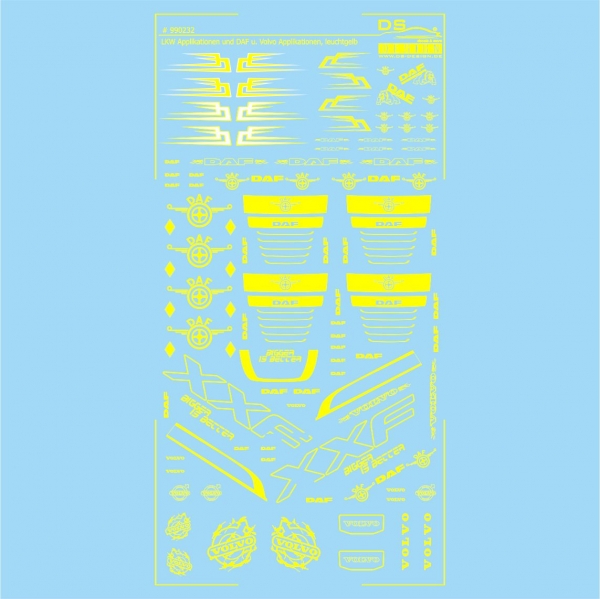 Das Decal # 990232 LKW Applikationen für DAF und Volvo ist im Siebdruck in Leuchtgelb produziert.